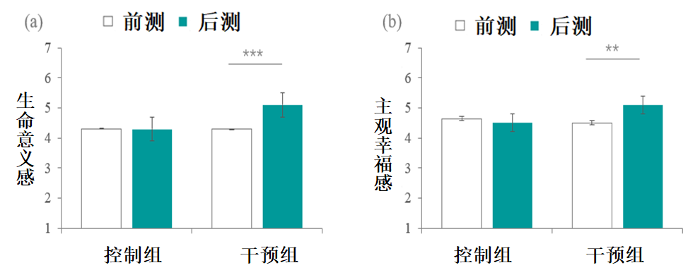 图2. 干预前后生命意义感(左)和主观幸福感(右)比较
