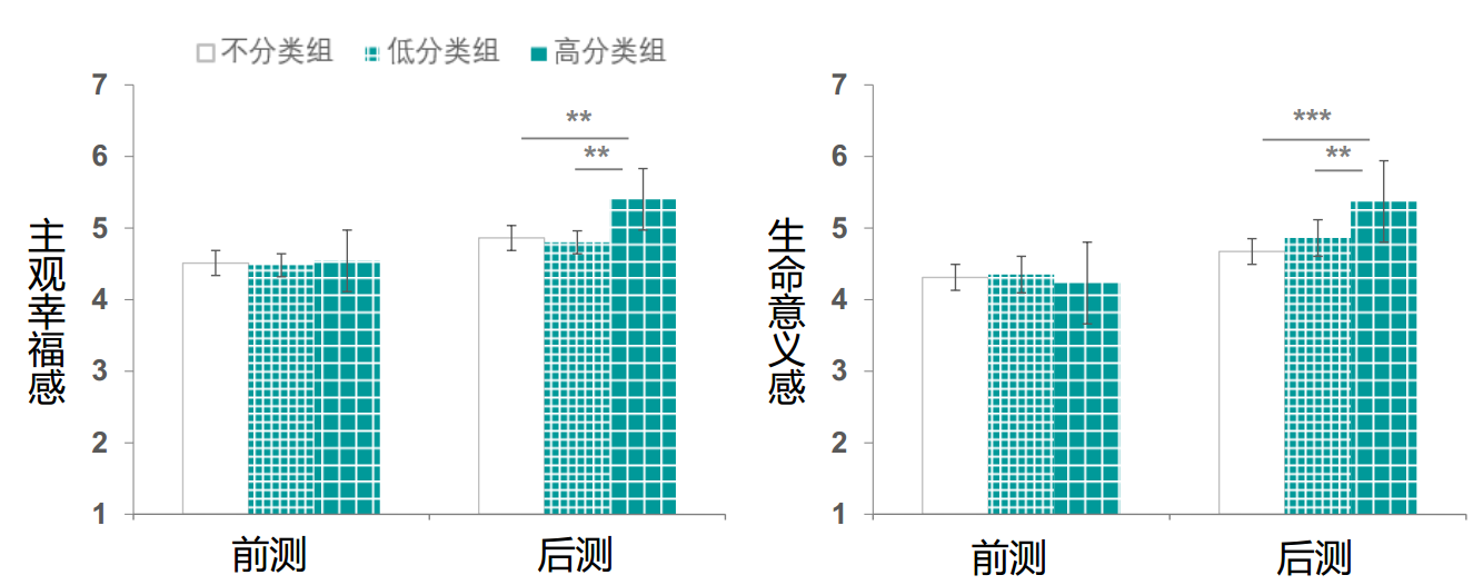 图3. 三个组别的主观幸福感(左)和生命意义感(右)比较
