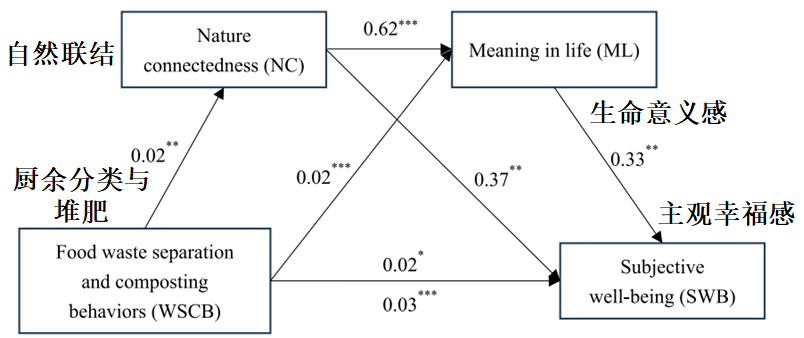图4. 自然联结和生命意义感在厨余分类堆肥行为和主观幸福感间的链式中介路径