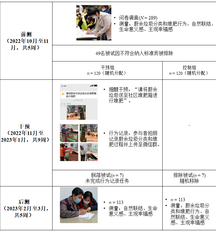 为理清上述问题,中国科学院心理研究所韩布新研究组刘萍萍副研究员及其团队成员在武汉八个社区开展了一项纵向现场干预实验,考察亲环境行为同幸福感的因果关联及其内在机制。厨余分类和堆肥是一种典型的亲环境行为,同可持续的废弃物处理方式相关。居民需将厨余垃圾(如剩菜剩饭、果皮等)分类并送到社区堆肥箱,将其转化为肥料,从而减少垃圾填埋和焚烧对环境的压力。基于亲生命假说,研究者提出假设,即厨余分类和堆肥行为有助于增强生命意义感和主观幸福感。